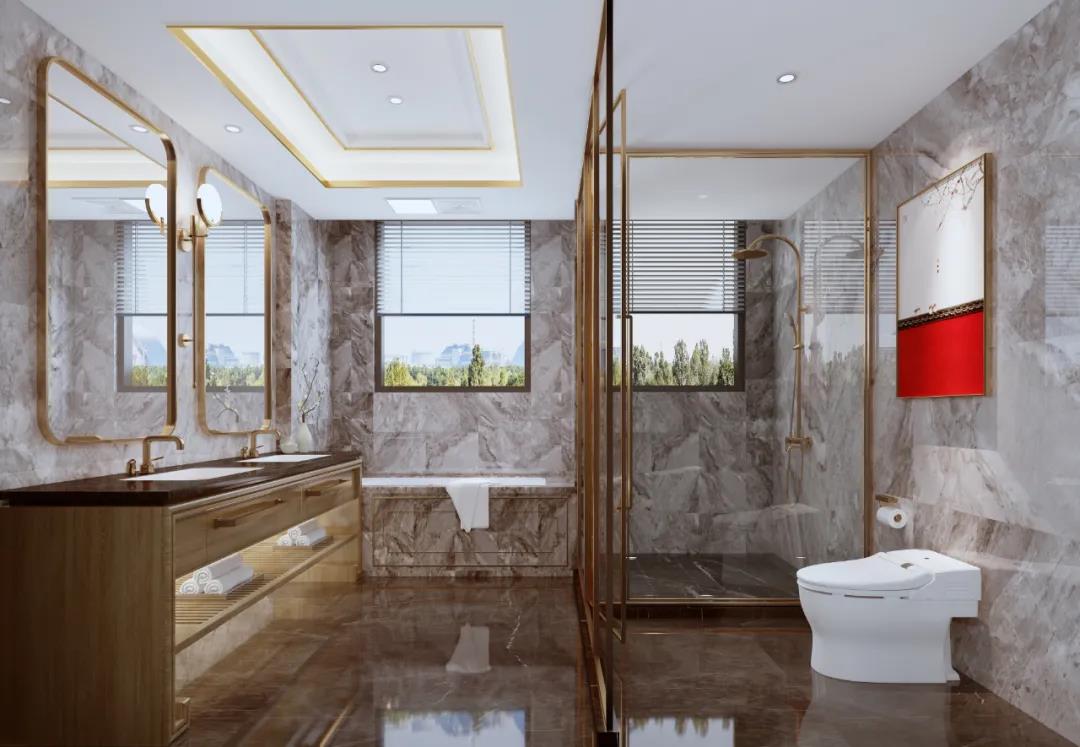 主衛采用雙台盆的設計,方便主人進行梳洗打扮。浴缸、淋浴間、馬(ma)桶(tong)均(jun)單(dan)獨(du)隔(ge)開(kai),盡(jin)可(ke)能(neng)減(jian)少(shao)衛(wei)生(sheng)間(jian)的(de)積(ji)水(shui)情(qing)況(kuang),保(bao)持(chi)衛(wei)生(sheng)間(jian)的(de)清(qing)潔(jie),方(fang)便(bian)打(da)掃(sao),也(ye)是(shi)為(wei)了(le)健(jian)康(kang)。除(chu)此(ci)之(zhi)外(wai),衛(wei)生(sheng)間(jian)的(de)裝(zhuang)潢(huang)均(jun)采(cai)用(yong)黃(huang)銅(tong)金(jin)屬(shu)、大理石花紋,打造出奢華之感。
