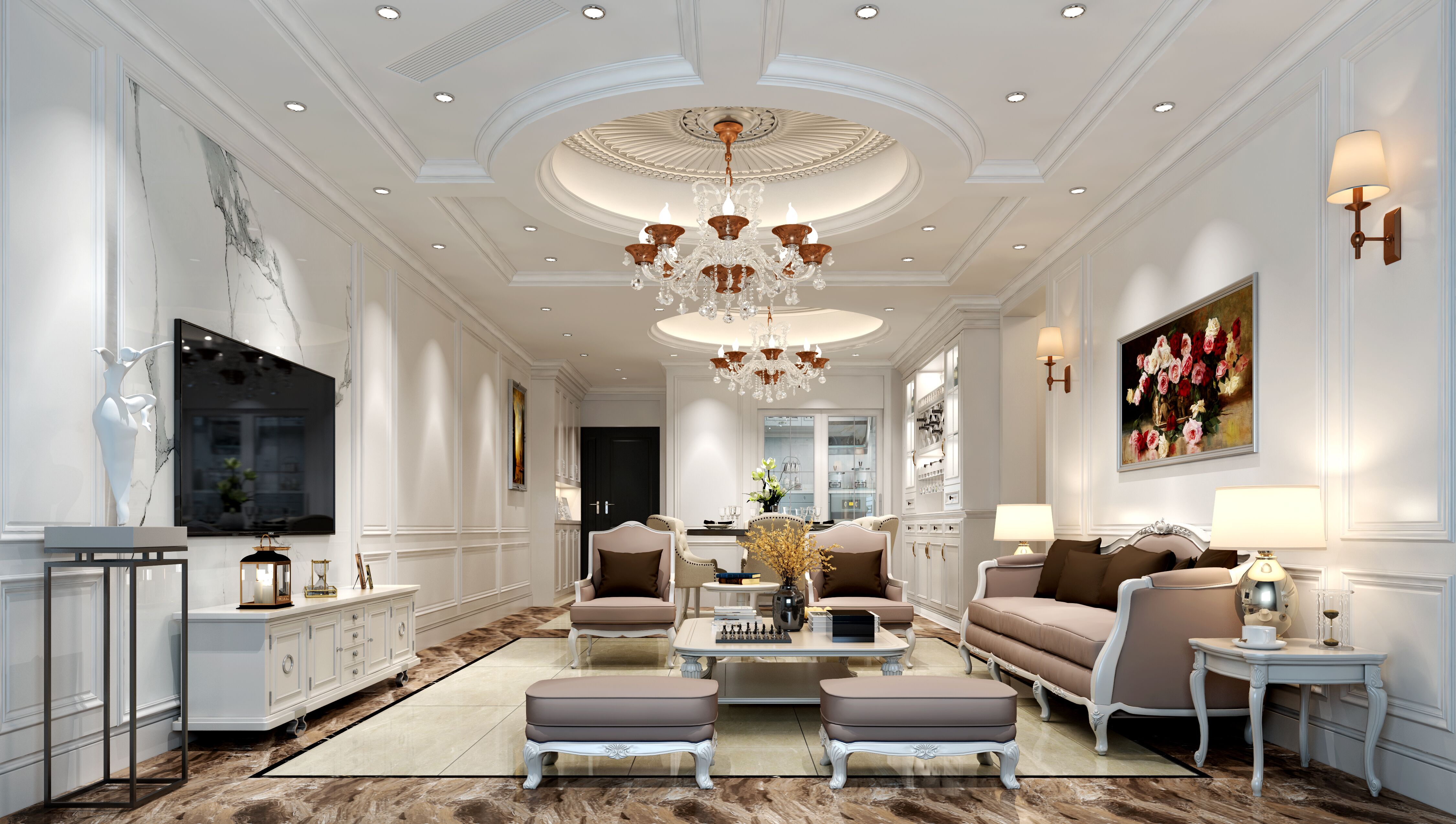 ● 戶型麵積:110㎡ ● 設計風格:現代美式 ● 整體預算:30萬 效果欣賞 客廳區域 主臥 女兒房