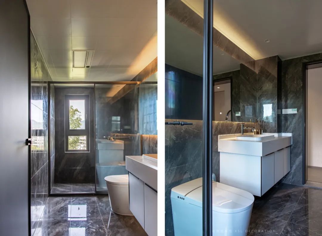 衛生間整體采用深色係打造,配以淺色台麵,整體簡潔、大氣、有品位。幹濕分離的設計很好地隔絕了水汽的侵蝕,保證衛生間的清潔,易於打掃。