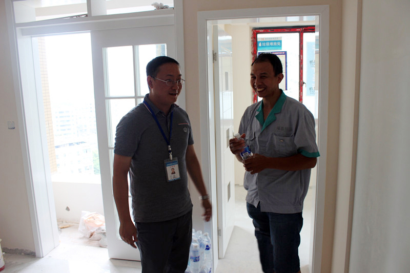 在送水之餘,工程部文經理和南坪店楊店長還細心地跟業主交流施工細節