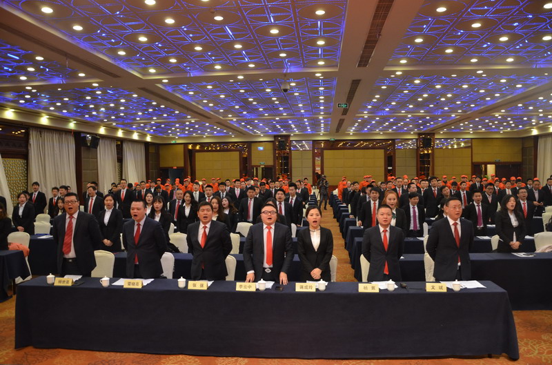 大會開場,全體員工起立宣讀公司口號