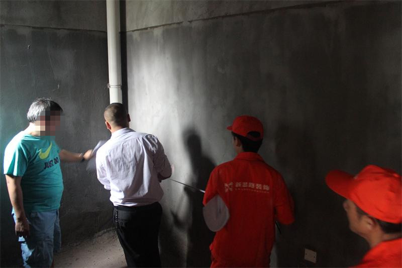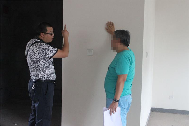 工程質檢正在認真檢查牆體是否存在空鼓情況。出現空鼓問題的,質檢會立即向物管反應,督促物管及時解決問題。