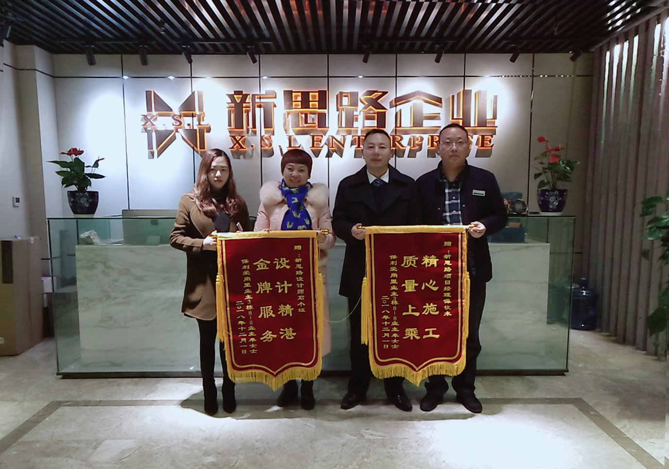2018年12月7日下午,來自保利愛尚裏的業主牟老師專程來到南坪總部將一麵印有“設計精湛,金牌服務”的錦旗交給我們設計師石小婭手中,又將一麵印有“精心施工,質量上乘”的錦旗交到我們項目經理譚欽術手中,以感謝新思路裝飾高品質工藝和優質貼心的服務。