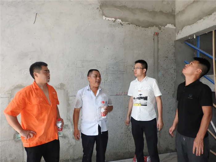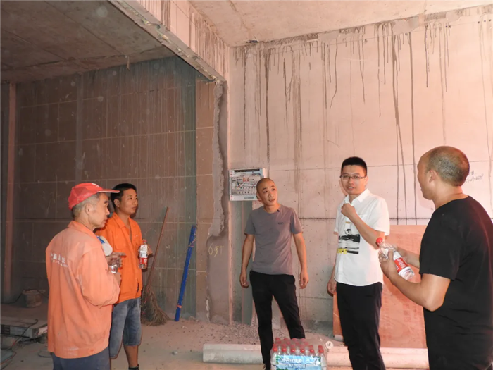 工程部經理等人在送水的同時也與工人交流施工的問題