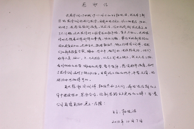 10月7日下午,華潤二十四城19-1-26的業主楊老師親自來到新思路裝飾南坪總部,將一封滿含謝意的感謝信送到了工程部文經理手中。