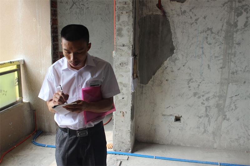 片區張經理正在認真檢查牆麵貼磚情況