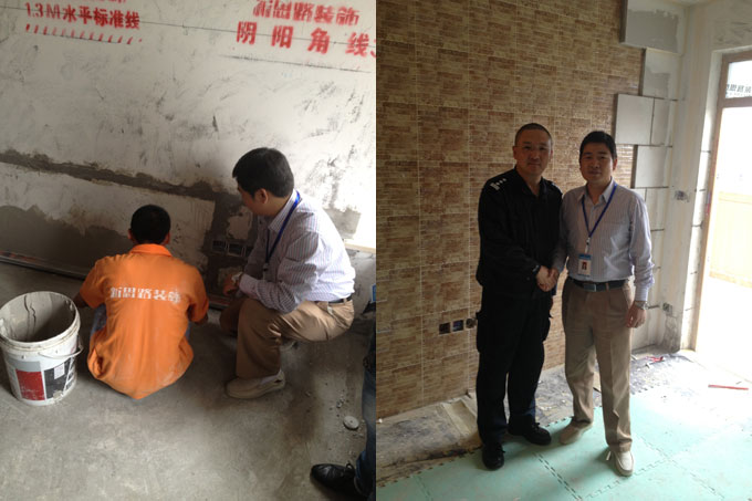 首(shou)先(xian),我(wo)們(men)來(lai)到(dao)位(wei)於(yu)沙(sha)坪(ping)壩(ba)濱(bin)江(jiang)路(lu)的(de)華(hua)宇(yu)金(jin)沙(sha)時(shi)代(dai)小(xiao)區(qu)。到(dao)達(da)施(shi)工(gong)現(xian)場(chang)正(zheng)值(zhi)漆(qi)工(gong)師(shi)傅(fu)緊(jin)張(zhang)有(you)序(xu)的(de)施(shi)工(gong),我(wo)們(men)首(shou)先(xian)對(dui)泥(ni)作(zuo)工(gong)藝(yi)進(jin)行(xing)了(le)查(zha)看(kan),瓷(ci)磚(zhuan)的(de)平(ping)整(zheng)度(du)、jiefengchadengyixiliejinxinglejianyan。zhangzongjiugongyixijieyudajiagongtongtantao,bingzaixianchangtichugongyishangdewenti,dajiadoujijidehuida。dangjizhangzongzhichu,womendemeiyiweiyuangongdouyaoduiwomendeshigonggongyiqingchudelejiedao,bingrushidegaozhikehu。zheyangcaishizhenzhengrangkehumingmingbaibaizhuangxiu。