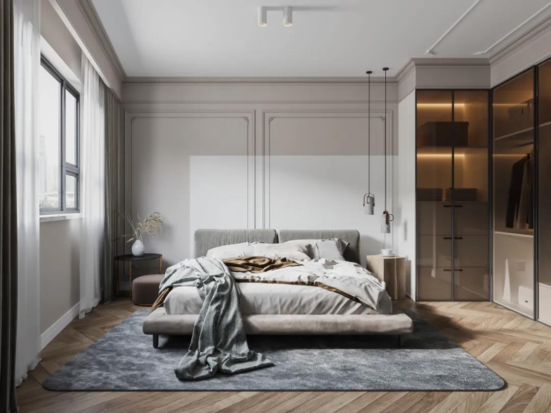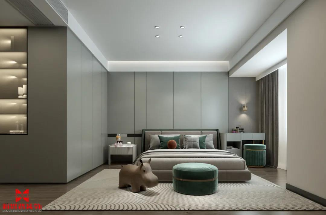 次臥沿用現代輕奢風格的設計理念,主體采用線條、顏色的搭配來進行裝飾,選擇柔和光源,打造出溫馨和寧靜的睡眠氛圍。