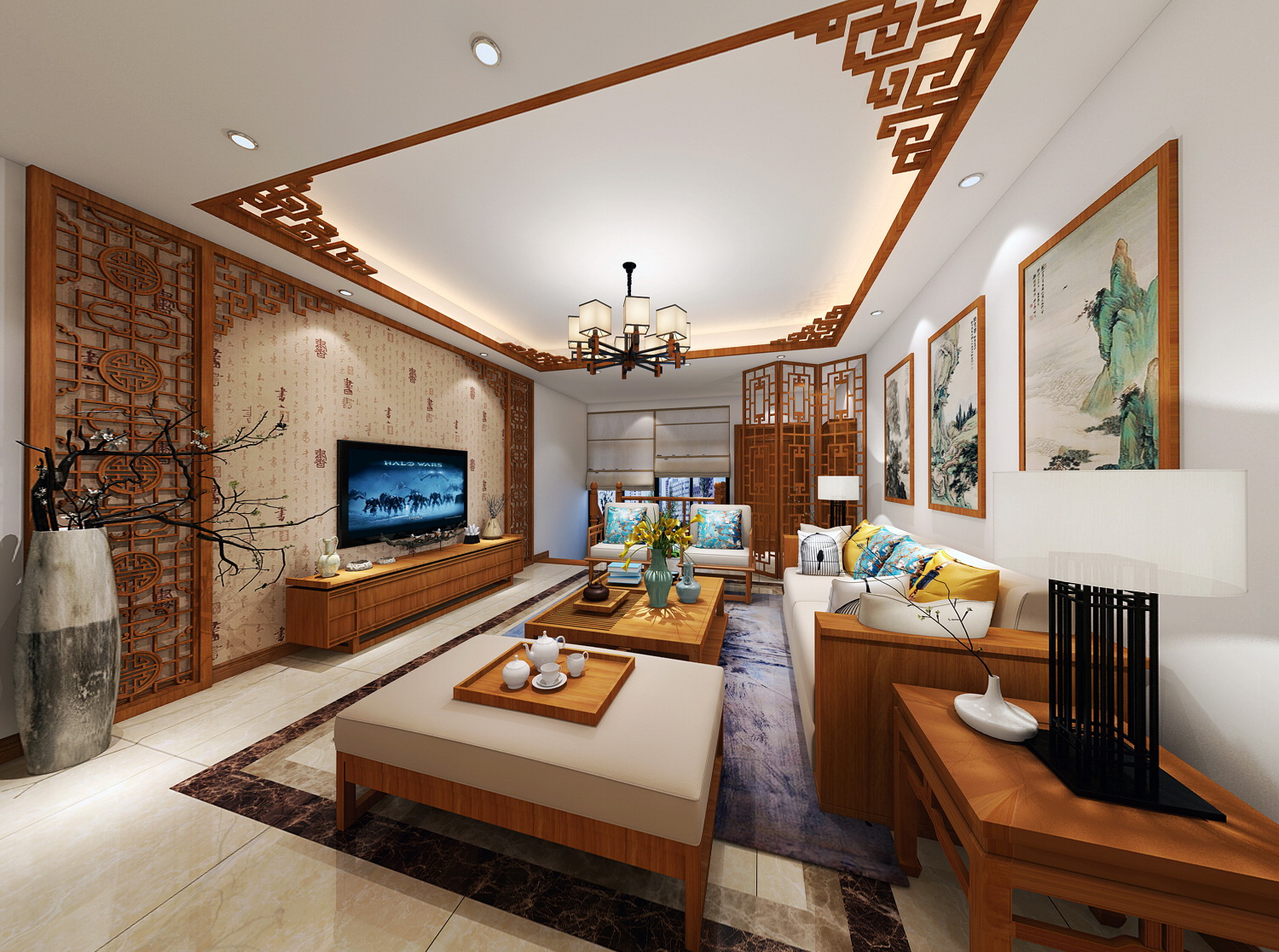 ● 戶型麵積:110㎡ ● 設計風格:新中式 ● 整體費用:20萬 效果欣賞 客廳 全景圖展示點擊 客廳 全景圖展示點擊