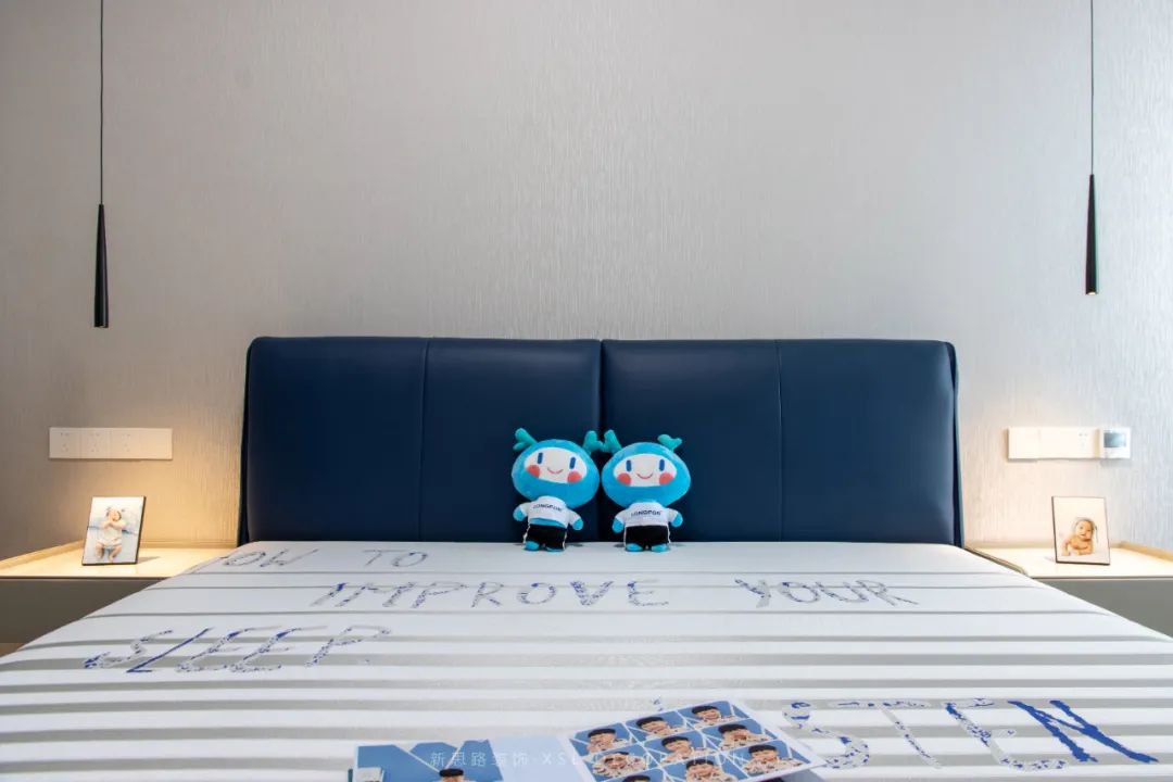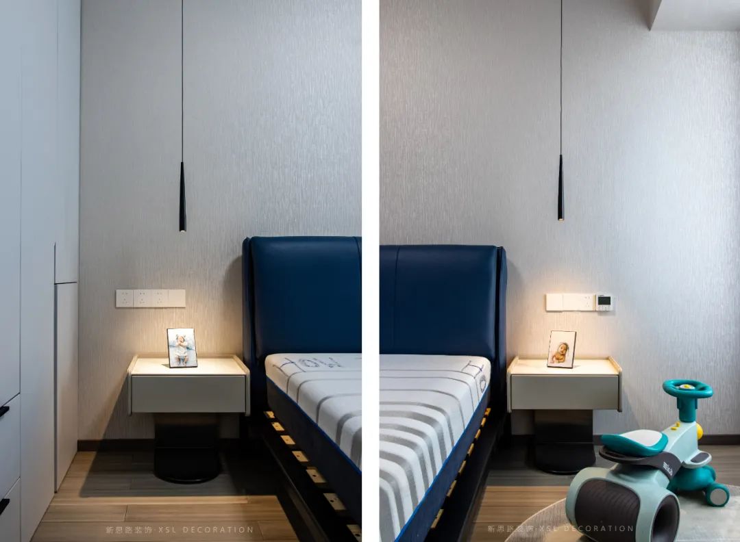 次ci臥wo作zuo為wei青qing少shao年nian的de睡shui眠mian空kong間jian,考kao慮lv到dao年nian齡ling的de增zeng長chang,所suo以yi延yan續xu簡jian約yue舒shu適shi的de色se調tiao。深shen藍lan色se床chuang頭tou點dian綴zhui形xing成cheng設she計ji美mei感gan,床chuang頭tou櫃gui與yu衣yi櫃gui相xiang結jie合he增zeng加jia層ceng板ban的de設she計ji,可ke以yi滿man足zu常chang用yong書shu籍ji或huo裝zhuang飾shi擺bai件jian的de拿na取qu,看kan似si簡jian單dan卻que使shi空kong間jian實shi現xian了le的de功gong能neng效xiao。