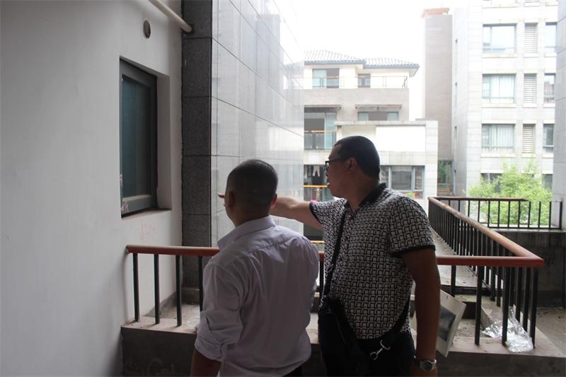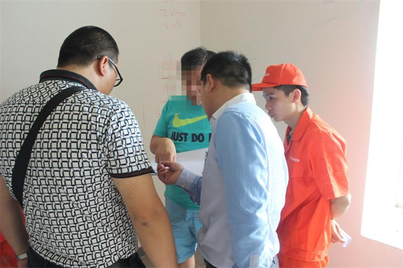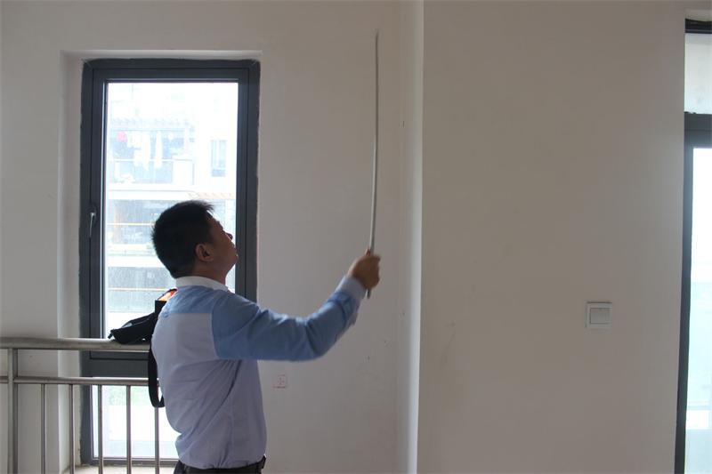 工程質檢正在認真檢查牆體是否存在空鼓情況。出現空鼓問題的,質檢會立即向物管反應,督促物管及時解決問題。