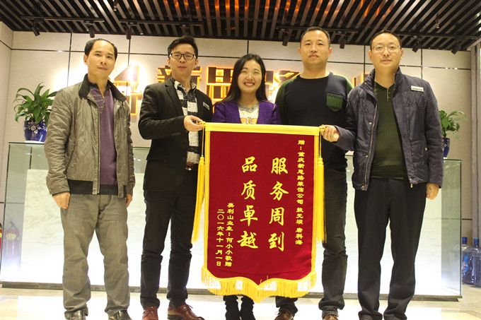 11月12日上午,美利山業主何老師及家人親臨南坪總部新思路裝飾為設計師敖元壩,工長唐科海送上一麵印有:“服務周到,品質卓越”的錦旗。這是對新思路裝飾品質的認可,這也正是我們所秉承:客戶滿意是我們唯一的工作標準”的裝修理念。