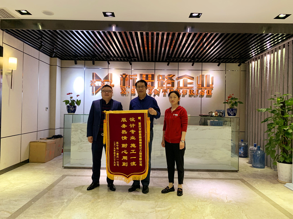 5月4日上午,公裝項目英中耐(重慶)公司段總,為新思路送上一麵大紅錦旗。“設計專業、施工一流;服務熱情、耐心周到”這16個字充分體現出對我們新思路裝飾公裝部的設計、施工及服務的高度認可。