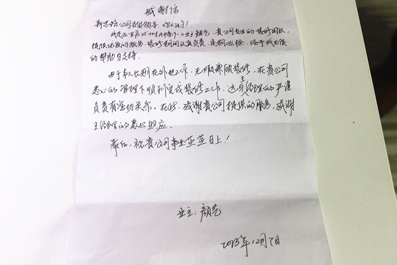 顏老師在信中表示:“由(you)於(yu)本(ben)人(ren)長(chang)期(qi)在(zai)外(wai)地(di)工(gong)作(zuo),無(wu)暇(xia)兼(jian)顧(gu)裝(zhuang)修(xiu),在(zai)貴(gui)公(gong)司(si)的(de)悉(xi)心(xin)管(guan)理(li)下(xia)順(shun)利(li)完(wan)成(cheng)裝(zhuang)修(xiu)工(gong)作(zuo)。貴(gui)公(gong)司(si)專(zhuan)業(ye)的(de)裝(zhuang)修(xiu)團(tuan)隊(dui),提(ti)供(gong)優(you)質(zhi)的(de)服(fu)務(wu),裝(zhuang)修(xiu)期(qi)間(jian)王(wang)經(jing)理(li)認(ren)真(zhen)負(fu)責(ze),質(zhi)檢(jian)定(ding)期(qi)巡(xun)查(zha)工(gong)地(di),保(bao)證(zheng)了(le)工(gong)程(cheng)質(zhi)量(liang)。在(zai)此(ci),感(gan)謝(xie)貴(gui)公(gong)司(si)提(ti)供(gong)的(de)裝(zhuang)修(xiu)服(fu)務(wu),感(gan)謝(xie)王(wang)經(jing)理(li)的(de)細(xi)心(xin)照(zhao)應(ying)。”