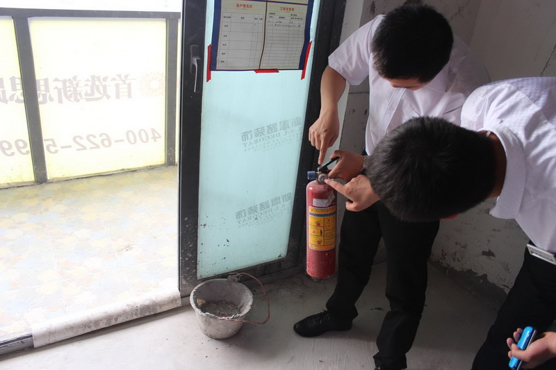 巡查人員正在認真檢查滅火器是否符合安全標準