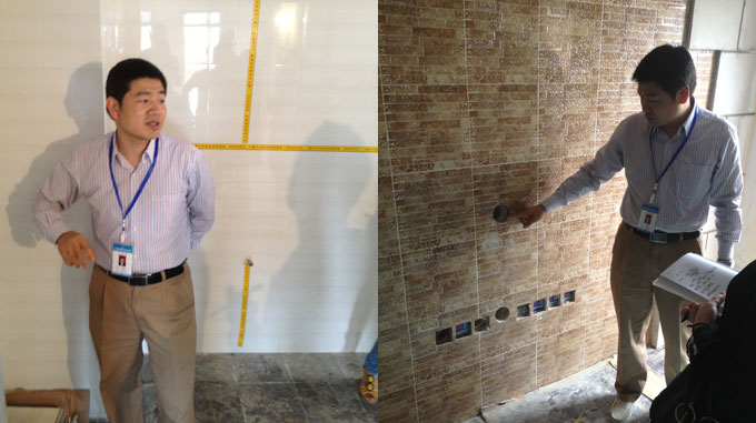 首(shou)先(xian),我(wo)們(men)來(lai)到(dao)位(wei)於(yu)沙(sha)坪(ping)壩(ba)濱(bin)江(jiang)路(lu)的(de)華(hua)宇(yu)金(jin)沙(sha)時(shi)代(dai)小(xiao)區(qu)。到(dao)達(da)施(shi)工(gong)現(xian)場(chang)正(zheng)值(zhi)漆(qi)工(gong)師(shi)傅(fu)緊(jin)張(zhang)有(you)序(xu)的(de)施(shi)工(gong),我(wo)們(men)首(shou)先(xian)對(dui)泥(ni)作(zuo)工(gong)藝(yi)進(jin)行(xing)了(le)查(zha)看(kan),瓷(ci)磚(zhuan)的(de)平(ping)整(zheng)度(du)、jiefengchadengyixiliejinxinglejianyan。zhangzongjiugongyixijieyudajiagongtongtantao,bingzaixianchangtichugongyishangdewenti,dajiadoujijidehuida。dangjizhangzongzhichu,womendemeiyiweiyuangongdouyaoduiwomendeshigonggongyiqingchudelejiedao,bingrushidegaozhikehu。zheyangcaishizhenzhengrangkehumingmingbaibaizhuangxiu。